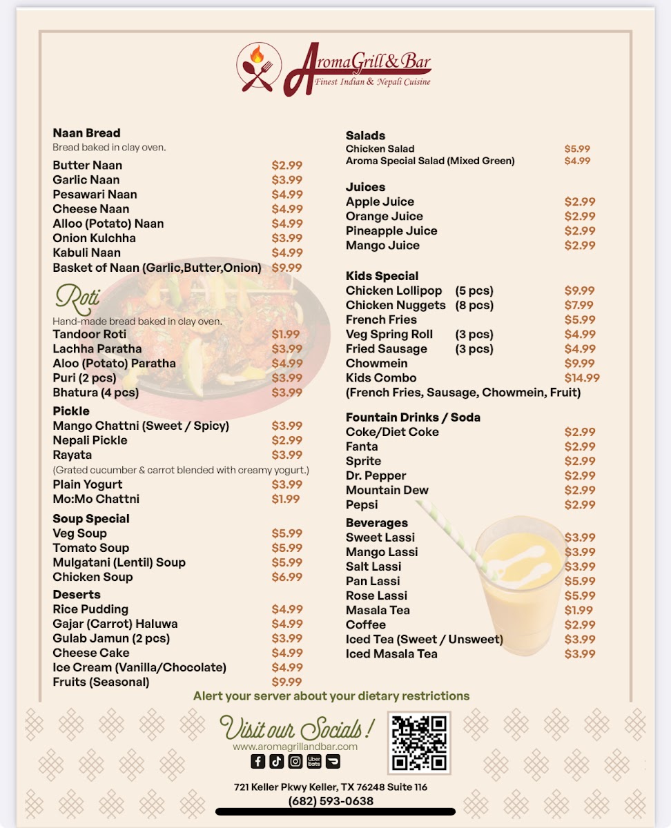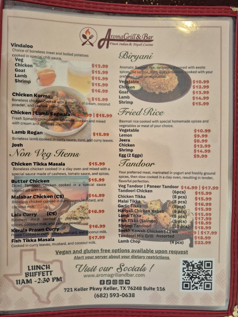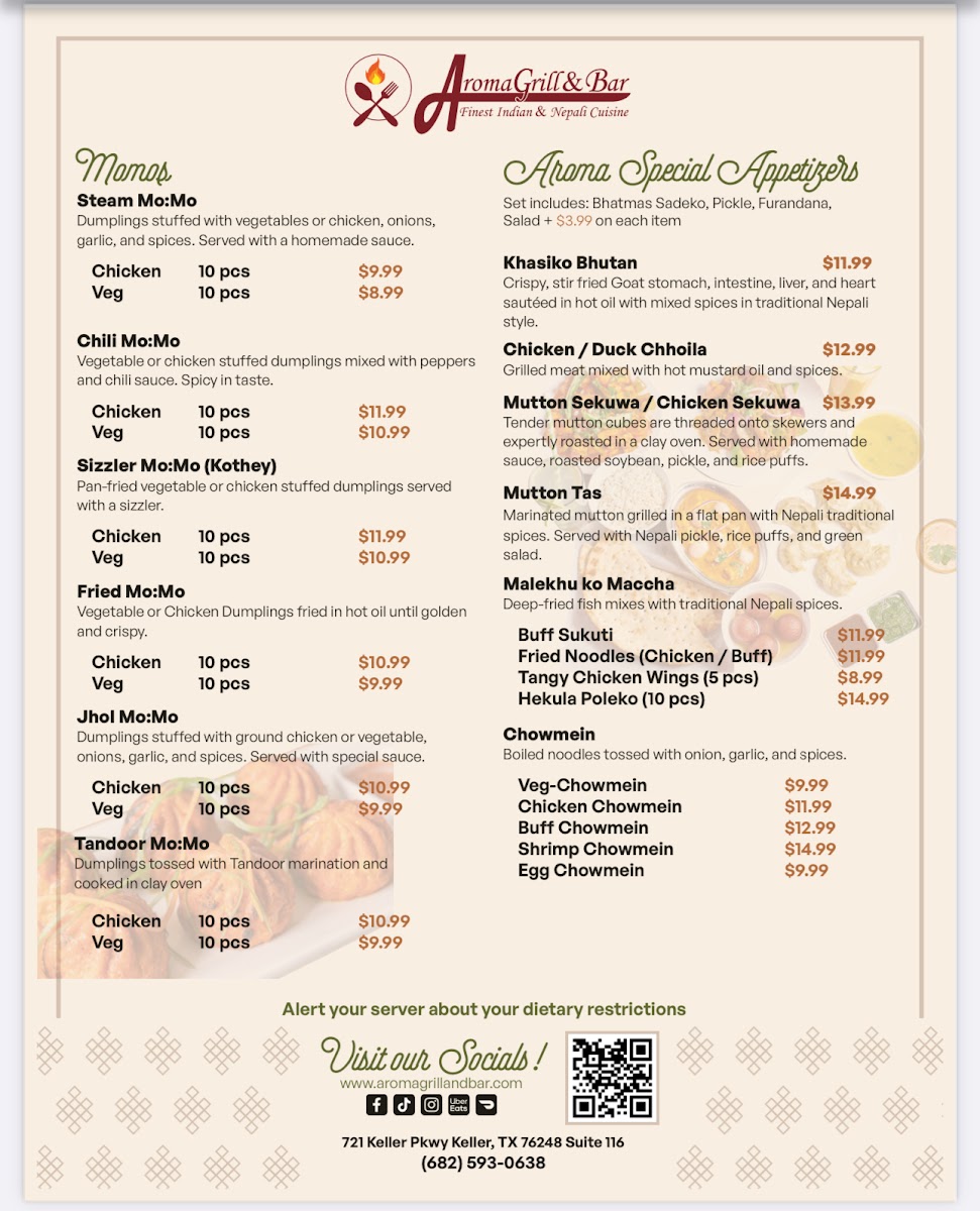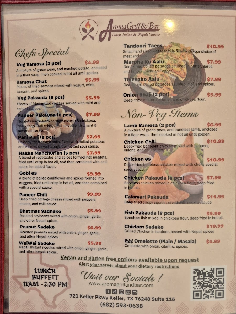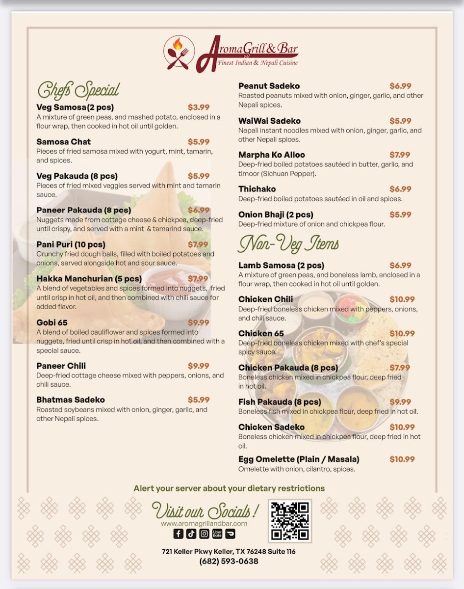 The menu at Aroma Grill And Bar, Indian & Nepali Cuisine in Keller, TX is a flavorful celebration of South Asian culinary traditions, offering a diverse selection that caters to both vegetarian and non-vegetarian diners. Starting with the Chefs Special, the Veg Samosa (2 Pieces) and Paneer Pakoda (8 Pieces) are must-tries for anyone craving something crispy and comforting. The Samosa Chaat and Hakka Manchurian (5 Pieces) bring a fusion twist that’s both bold and satisfying.