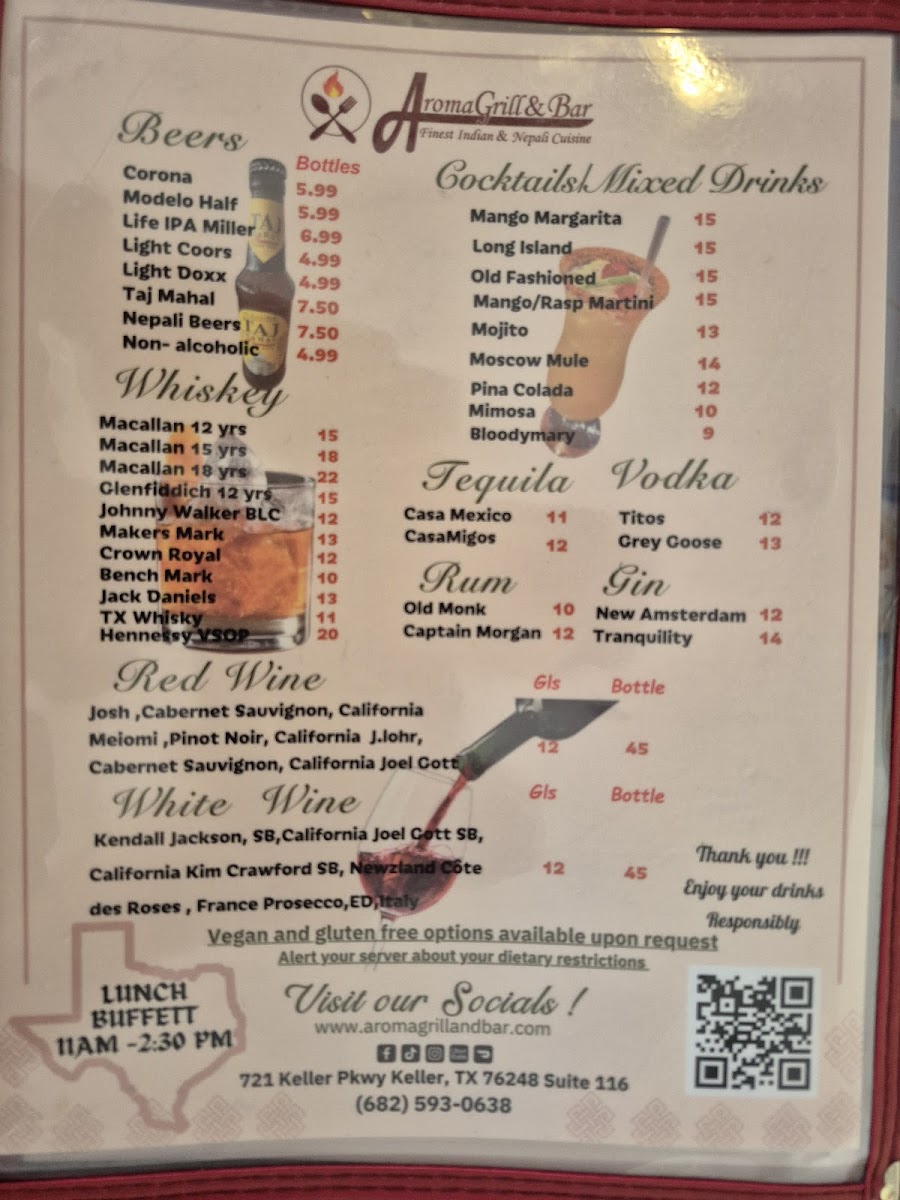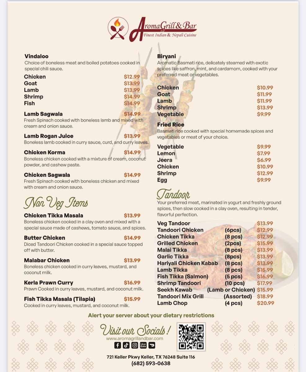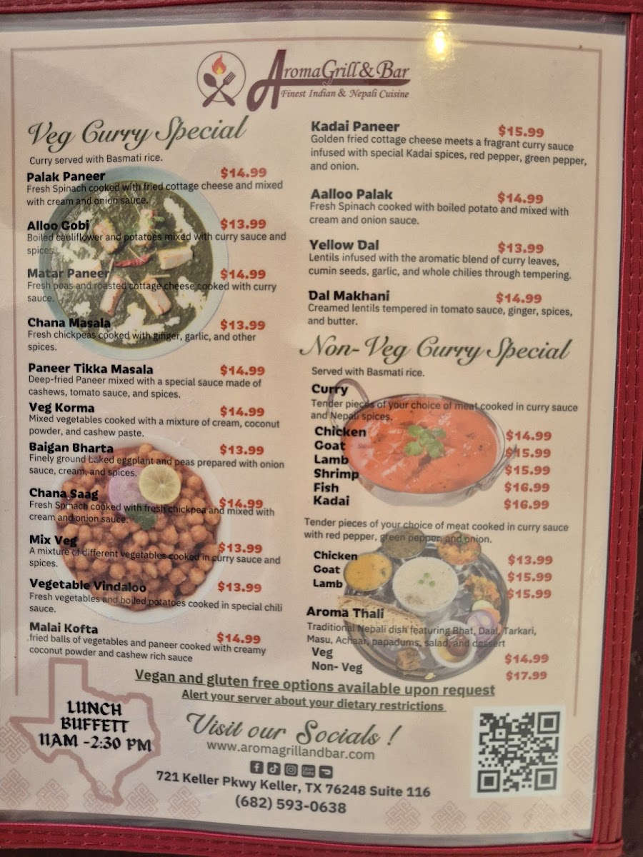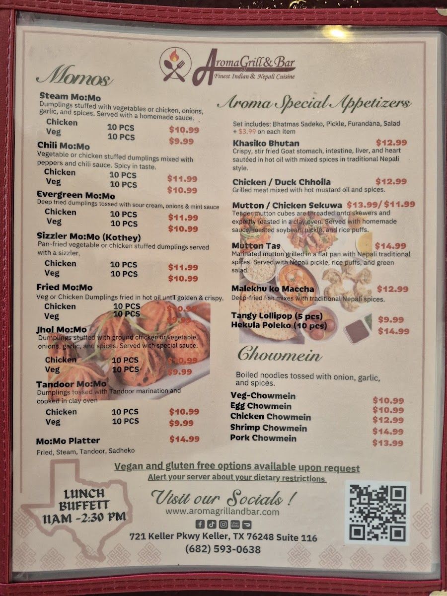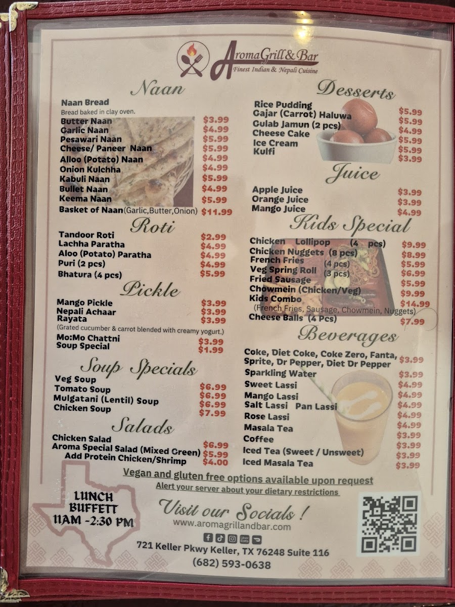 The menu at Aroma Grill And Bar, Indian & Nepali Cuisine in Keller, TX is a flavorful celebration of South Asian culinary traditions, offering a diverse selection that caters to both vegetarian and non-vegetarian diners. Starting with the Chefs Special, the Veg Samosa (2 Pieces) and Paneer Pakoda (8 Pieces) are must-tries for anyone craving something crispy and comforting. The Samosa Chaat and Hakka Manchurian (5 Pieces) bring a fusion twist that’s both bold and satisfying.